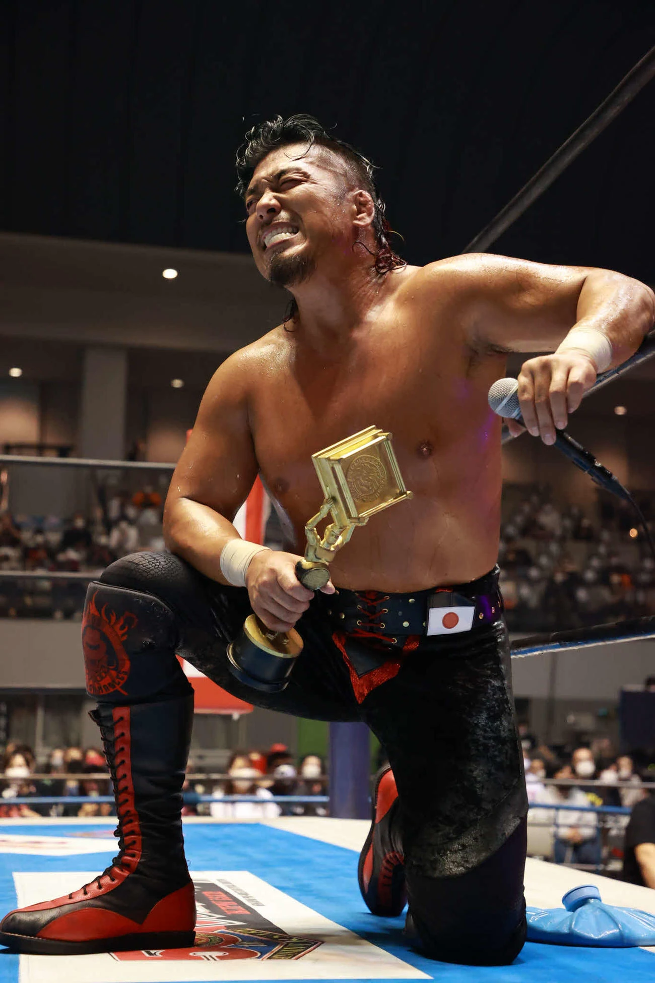 Takagi after defeating Kazuchika Okada to win the IWGP World Heavyweight Champion at Dominion 6.6 in Osaka-jo Hall